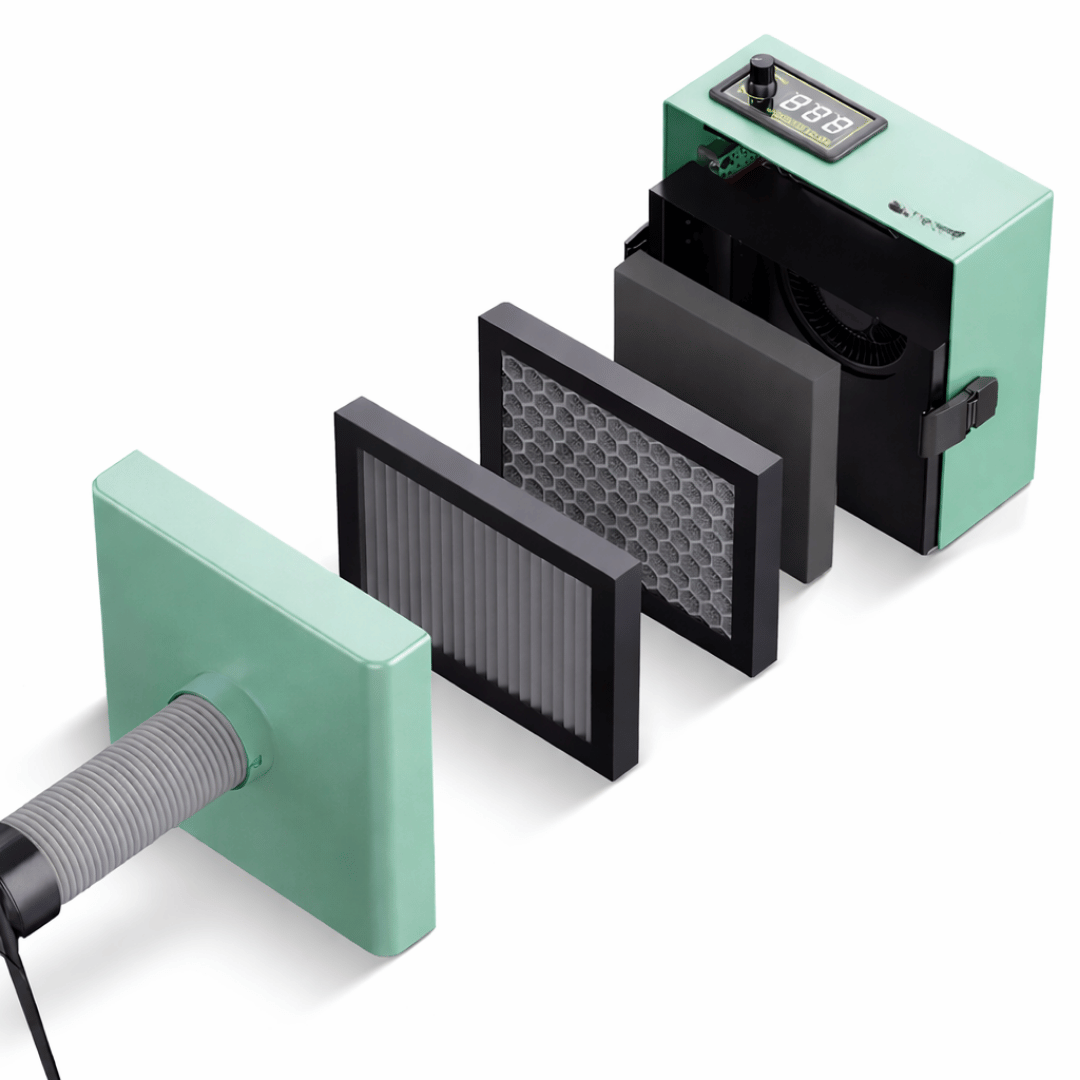 Der erste Hochdichtheitsfilter fängt große Partikel wie Staub und Gipsstaub ein; der zweite, ein Aktivkohlefilter, entfernt Gerüche und VOCs; und der dritte, ein H18-Hocheffizienzfilter, entfernt mindestens 99,98 % der Partikel bis zu 0,3 Mikrometern (µm).