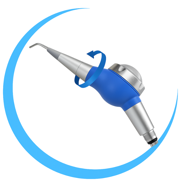 Sein attraktives und ergonomisches Design ermöglicht eine präzise und bequeme Handhabung. Mit 360°-Drehung gewährleistet es die effektive Entfernung von Zahnstein in schwer zugänglichen Bereichen. Der Strahl wird gleichmäßig verteilt, ohne Spritzer zu verursachen, und das System wurde speziell entwickelt, um Rückfluss und Verstopfungen zu vermeiden.